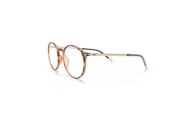 Okrągłe okulary korekcyjne Sylt Tortoiseshell. Delikatnie matowy front w duecie z bardzo lekką oprawką. Zauszniki to subtelne połączenie złota z czarnym. Na pewno wpadną Ci w oko, jeśli tylko je przymierzysz.